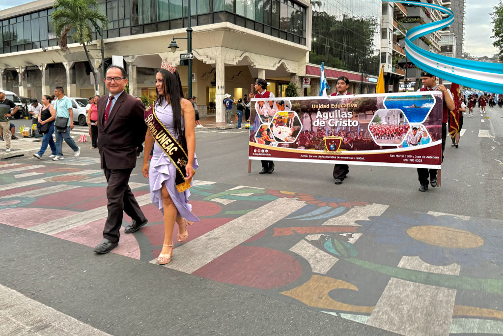 El 9 de Octubre, fecha que marca el nacimiento de la libertad guayaquileña, volvió a vestirse de azul, celeste y blanco. Nuestros estudiantes participaron con entusiasmo y orgullo en el tradicional desfile cívico, recorriendo el Malecón Simón Bolívar y la emblemática calle 9 de Octubre, escenarios que guardan la memoria de los héroes que forjaron la independencia de Guayaquil.